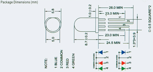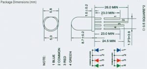 Stattdessen benötige ich eine mehrfarbige LED, deren Grundfarben alle einzeln angesteuert werden können. Solche LEDs kann man kaufen, beispielsweise diese hier mit gemeinsamer Kathode.