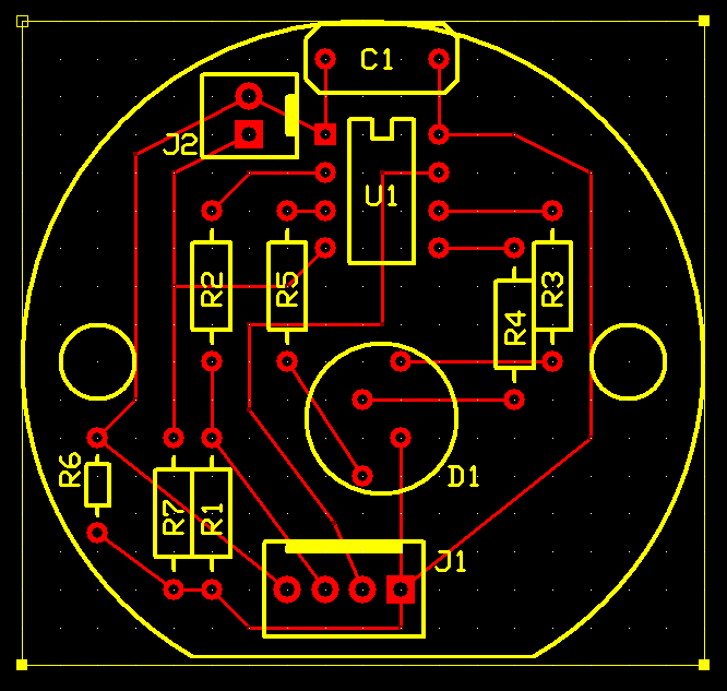 Um den nicht benötigten Eingang C3 doch noch sinnvoll einzusetzen, entschied ich mich, einen Taster vorzusehen, der im Picaxe eine Funktion auslösen kann. Etwa könnte ein festes Farbwechselprogramm ausgelöst werden, oder die LED könnte ein- und ausgeschaltet werden. Der Taster kann an J2 angeschlossen werden.