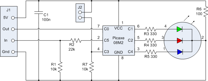 Jetzt brauche ich eine Steuerelektronik, die USB-Signale entgegennimmt und somit von einem Computer bedient werden kann, und aufgrund dieser Signale die Farben einer solchen LED steuert. Ein Kumpel wies mich auf den Picaxe Mikrocontroller hin, der einen seriellen Eingang hat und ein paar digitale Ausgänge, mit denen die verschiedenen Farben einer LED gesteuert werden können. Ich kam zu diesem Schaltschema: